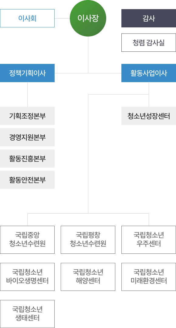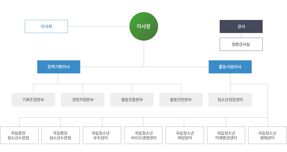 오른쪽은 '활동사업이사'로, 하위 조직에 '활동안전본부', '청소년성장센터'가 있으며, 연결된 소속 기관은 '국립청소년해양센터', '국립청소년미래환경센터',
